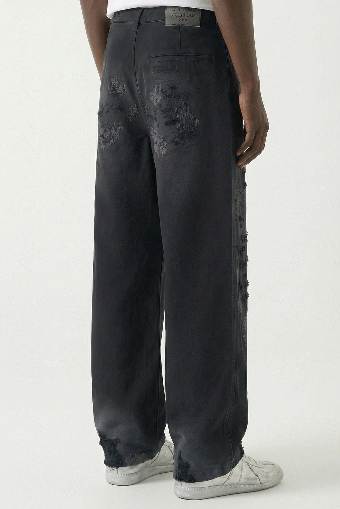 Acne Studios Spring/Summer 2026 collection presents these black wide‑leg jeans with a relaxed, baggy silhouette and natural wear‑and‑tear distressing throughout. Finished with standard belt loops and a zip fly for classic denim structure.