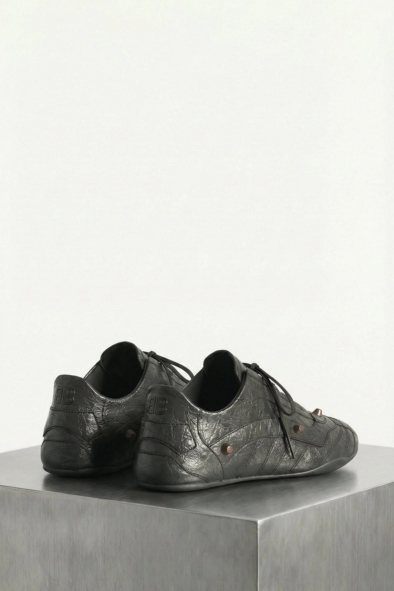 Balenciaga's Spring/Summer 2026 collection presents these sheepskin lace-up City Sneakers featuring tone-on-tone top-stitching and brass studs. Debossed Balenciaga logos at the tongue, exterior, and heel.