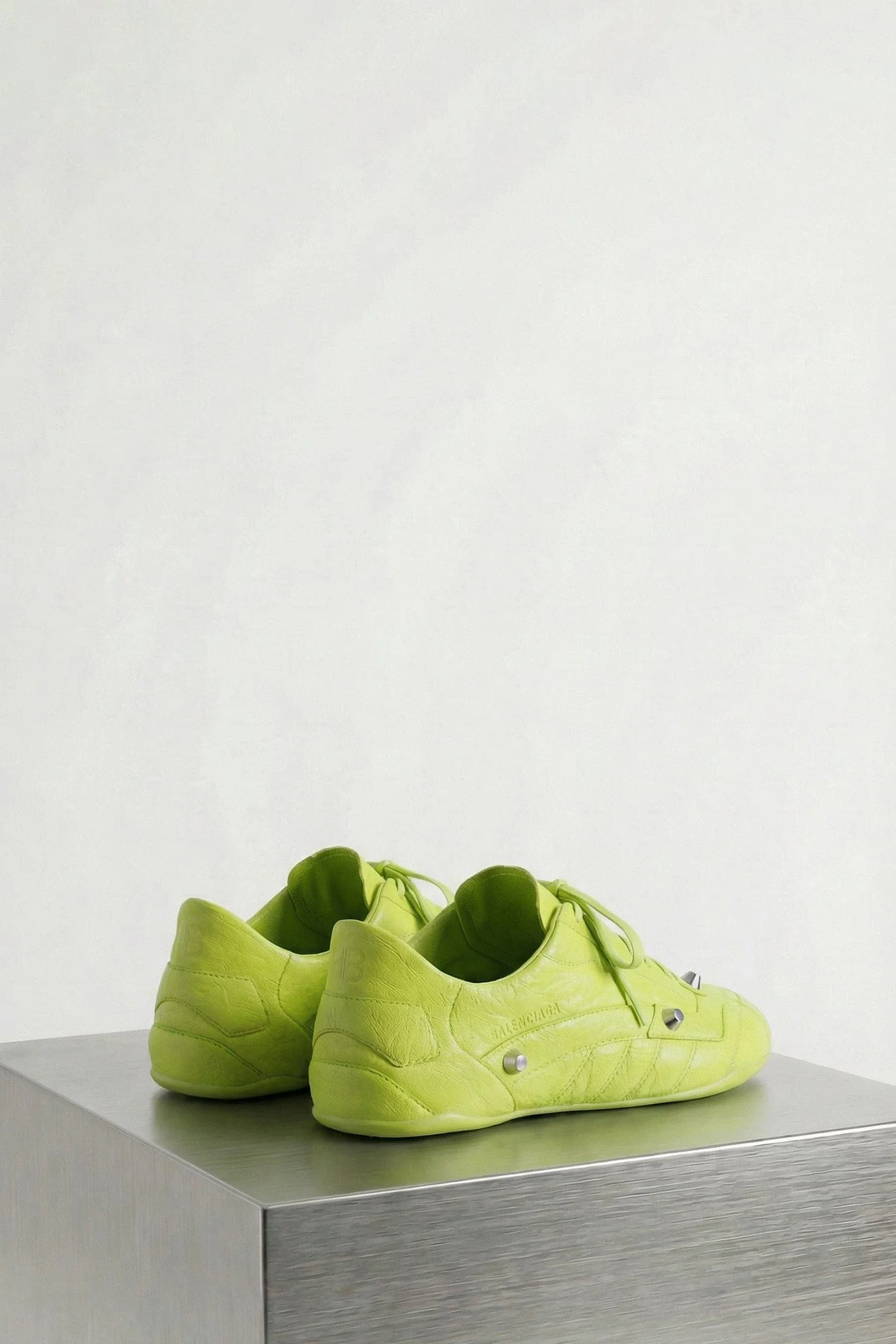 Balenciaga's Spring/Summer 2026 collection presents these sheepskin lace-up sneakers with a tone-on-tone top-stitching and silver studs. Debossed Balenciaga logos at the tongue, exterior, and heel.