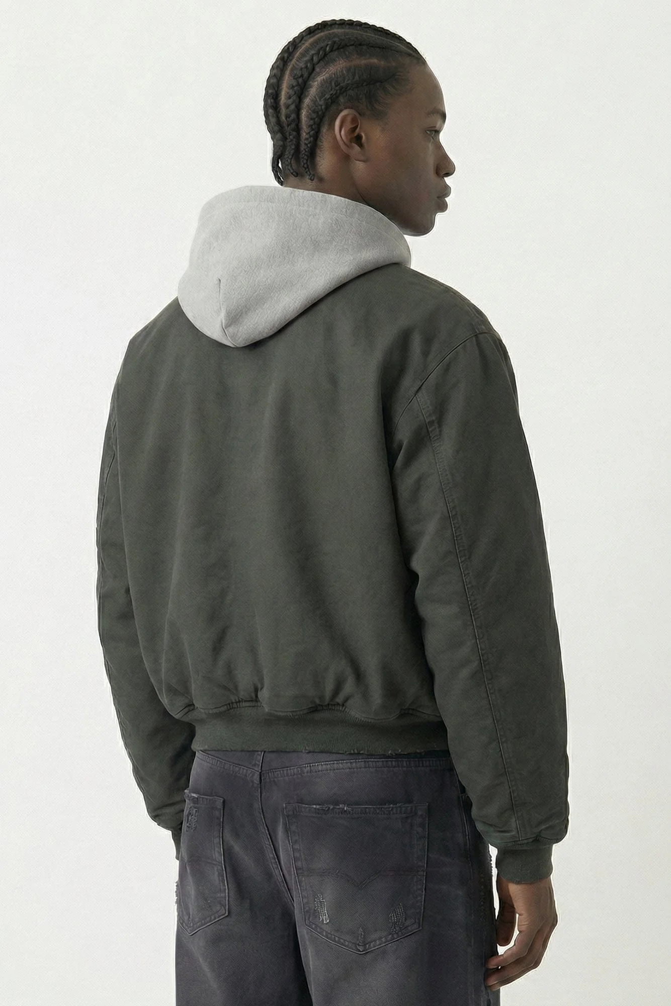 Balenciaga's Spring/Summer 2026 collection presents this hooded bomber jacket in cotton and polyamide canvas with a zip closure. Features two front snap pockets, bomber pocket on left sleeve, and ribbed trims.