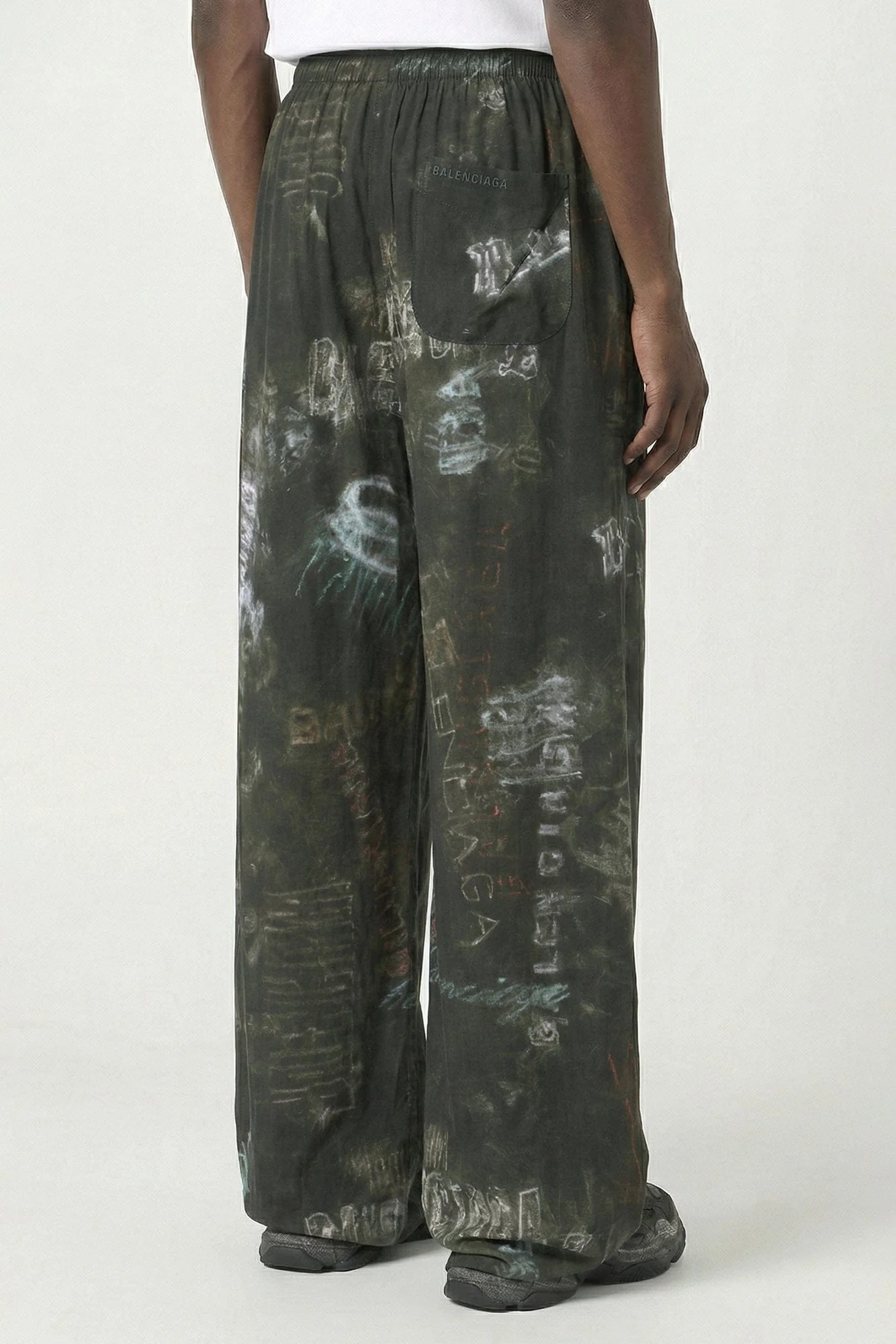Balenciaga's Spring/Summer 2026 collection presents these pants in a washed viscose poplin with mid-waist and elasticated waistband. Features two slash pockets and back patch pocket with embroidered Balenciaga logo.