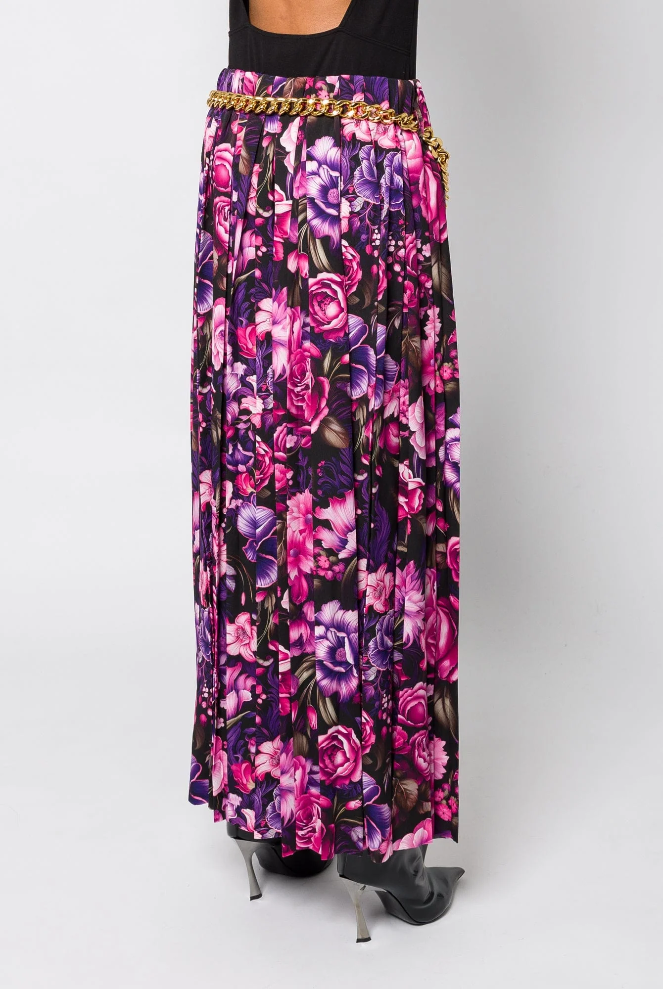This skirt from Balenciaga's Fall/Winter 2024 collection features a vibrant AI floral print in shades of pink and purple on a black background. The flowing, pleated design creates a voluminous silhouette, accentuated by a chunky gold chain detail at the waist.