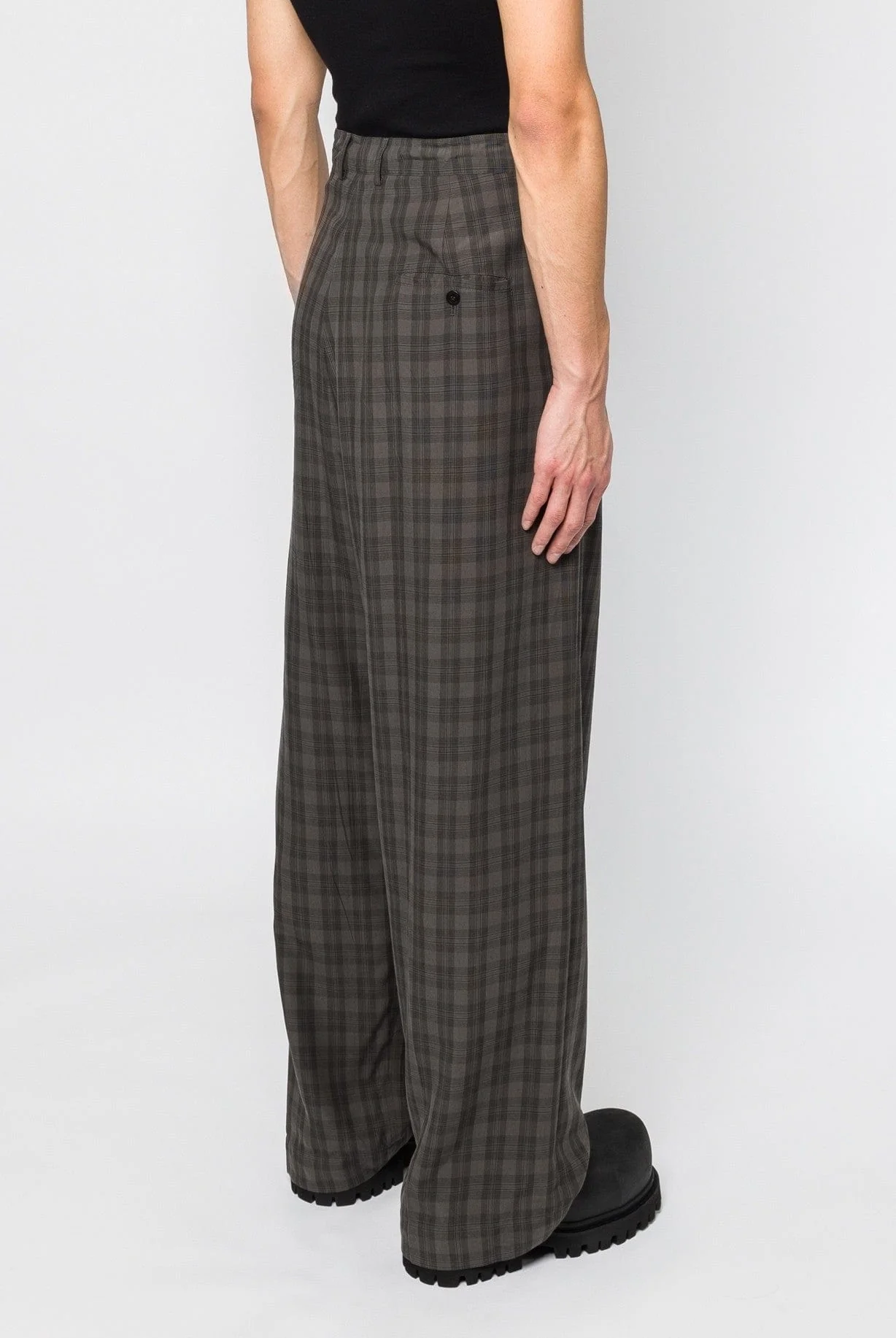 From Balenciaga's Spring/Summer 2025 collection, the Fluid Prince of Wales Tailored Pants offer a fluid silhouette that adapts to various body types while maintaining structured tailoring principles. They feature a Prince of Wales check pattern with pinstripes, combining traditional tailoring with Balenciaga's contemporary approach to proportion and fit.