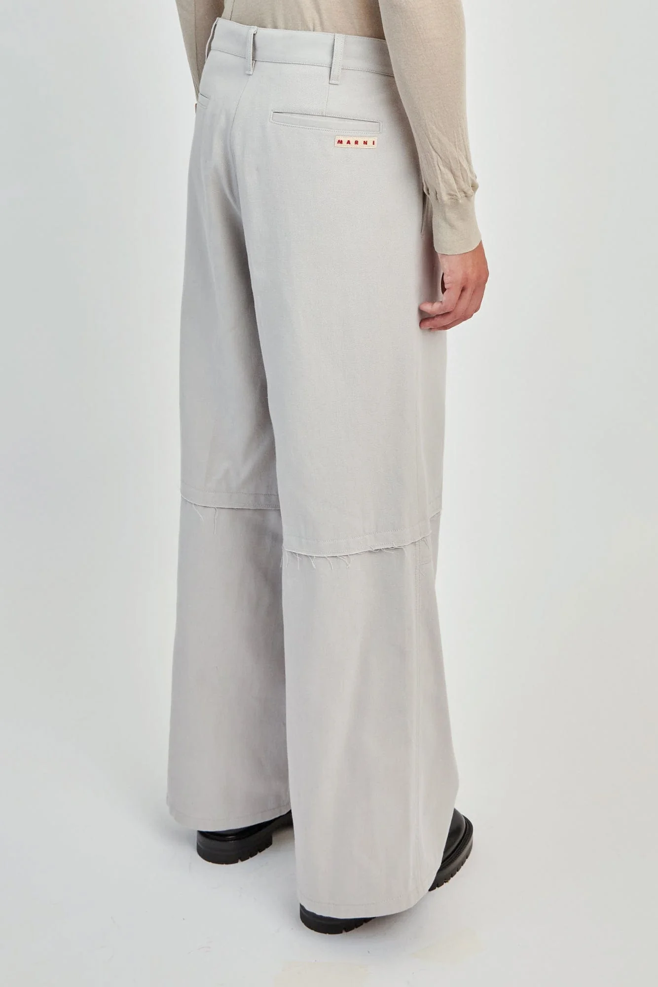 For Pre-Fall 2024, Marni reimagined a pair of classic double-knee work pants by crafting them with a wide-leg silhouette and frayed edges at the knees.