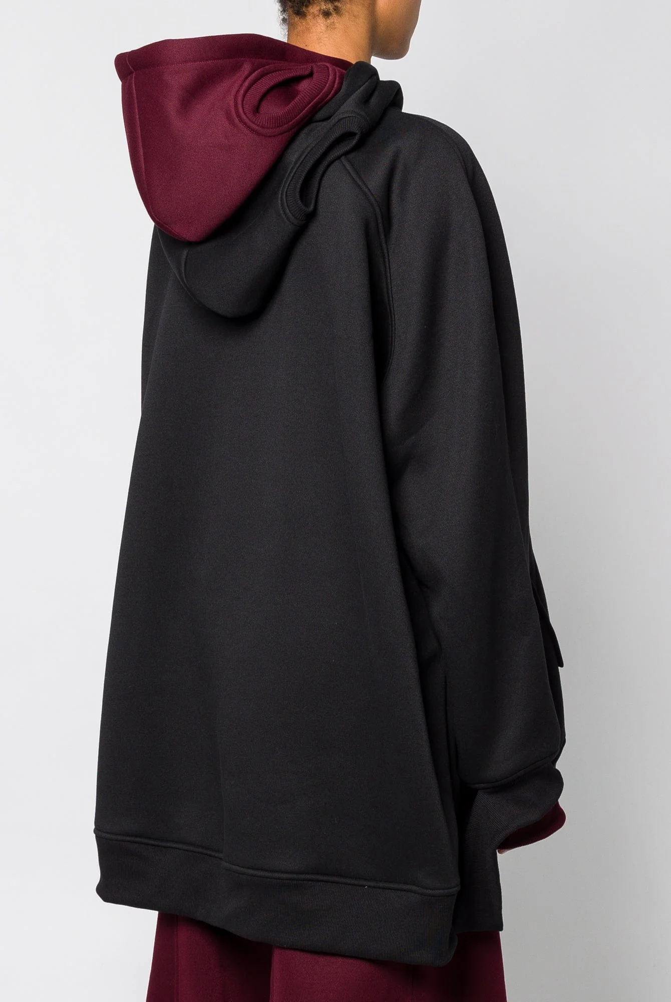 This double hood hoodie from Melitta Baumeister's Fall/Winter 2024 collection features a black outer layer with a burgundy inner lining. It has an oversized silhouette and extended length. The design includes zippered front closure and an extra long drawstring.