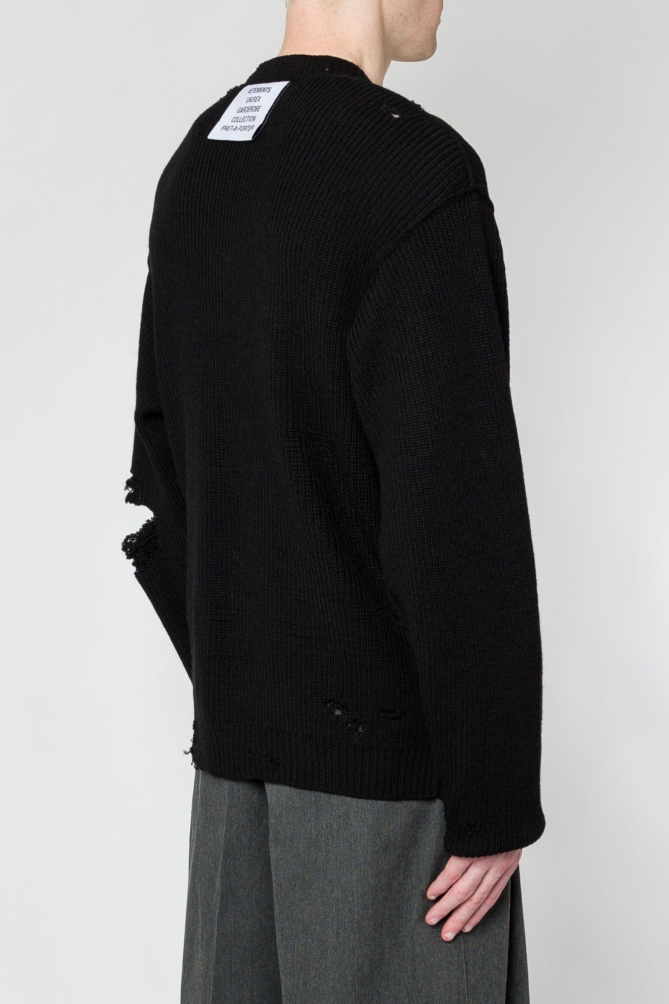 Vetements introduces a distressed wool sweater for their Fall/Winter 2024 collection. This knit piece features intentional wear throughout, with frayed edges adding to its deconstructed aesthetic. The sweater is constructed with a ribbed mock neck, hem, and cuffs, while dropped shoulders contribute to its relaxed silhouette.