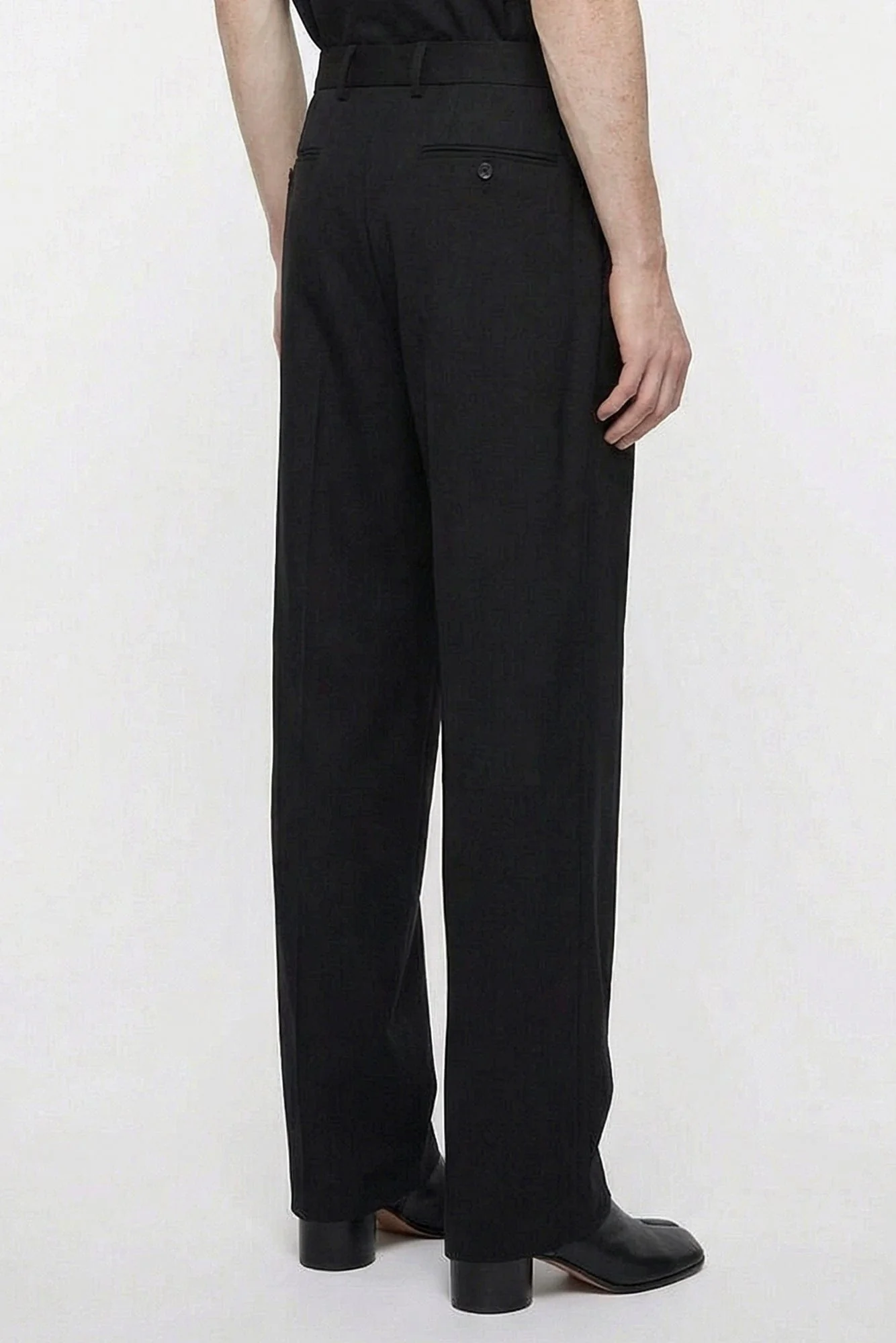 The MM6 Spring/Summer 2026 collection presents these black straight-leg tailored trousers featuring front pleats and signature white stitching on the waistband and back for subtle contrast.