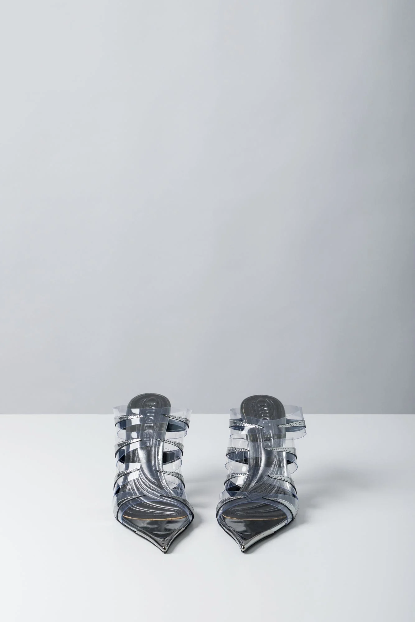 Mugler presents the PVC Mule in Gun Metal apart of their Fall/Winter 2024 collection. The mixed-material mule is comprised of leather and plexiglass straps across the foot with a pointed open toe and back. The shoe is held by a 95 mm stiletto heel.