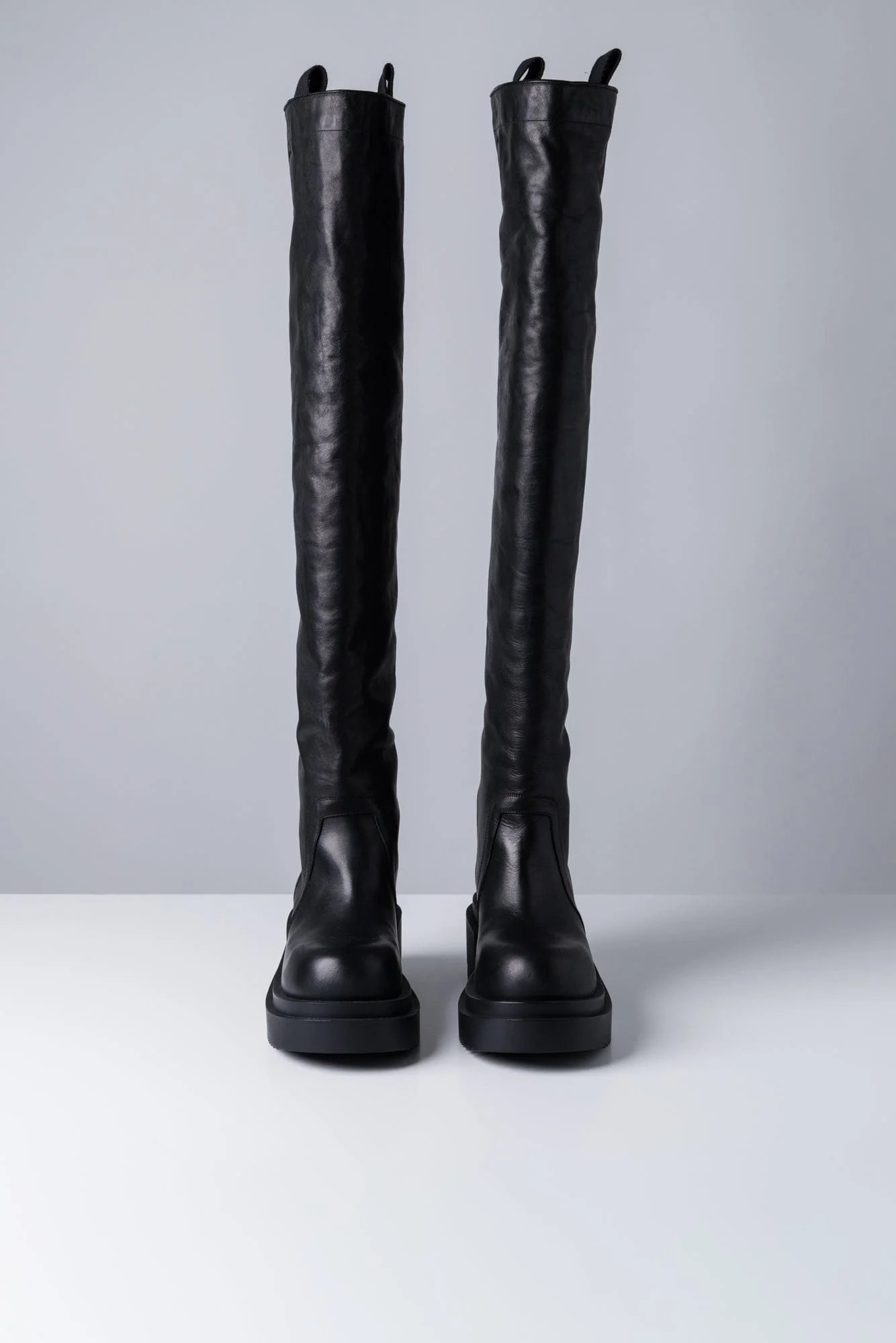 Rick Owens Fall/Winter 2025 collection presents these thigh-high Wader Bogun boots with rounded toes and a geometric heel counter that extends up the back calf. Finished with two webbing pull tabs and a Bogun rubber mega creeper sole featuring a toothed square heel.