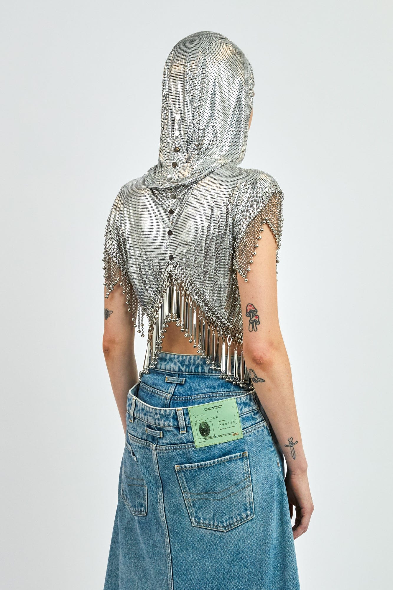For Spring/Summer 2024, Julien Dosena took direct inspiration from the F/W 1997 runway to craft this hooded chainmail top. Featuring a slouchy hood and aluminum fringe along the hem, this top has a flair for the dramatic.