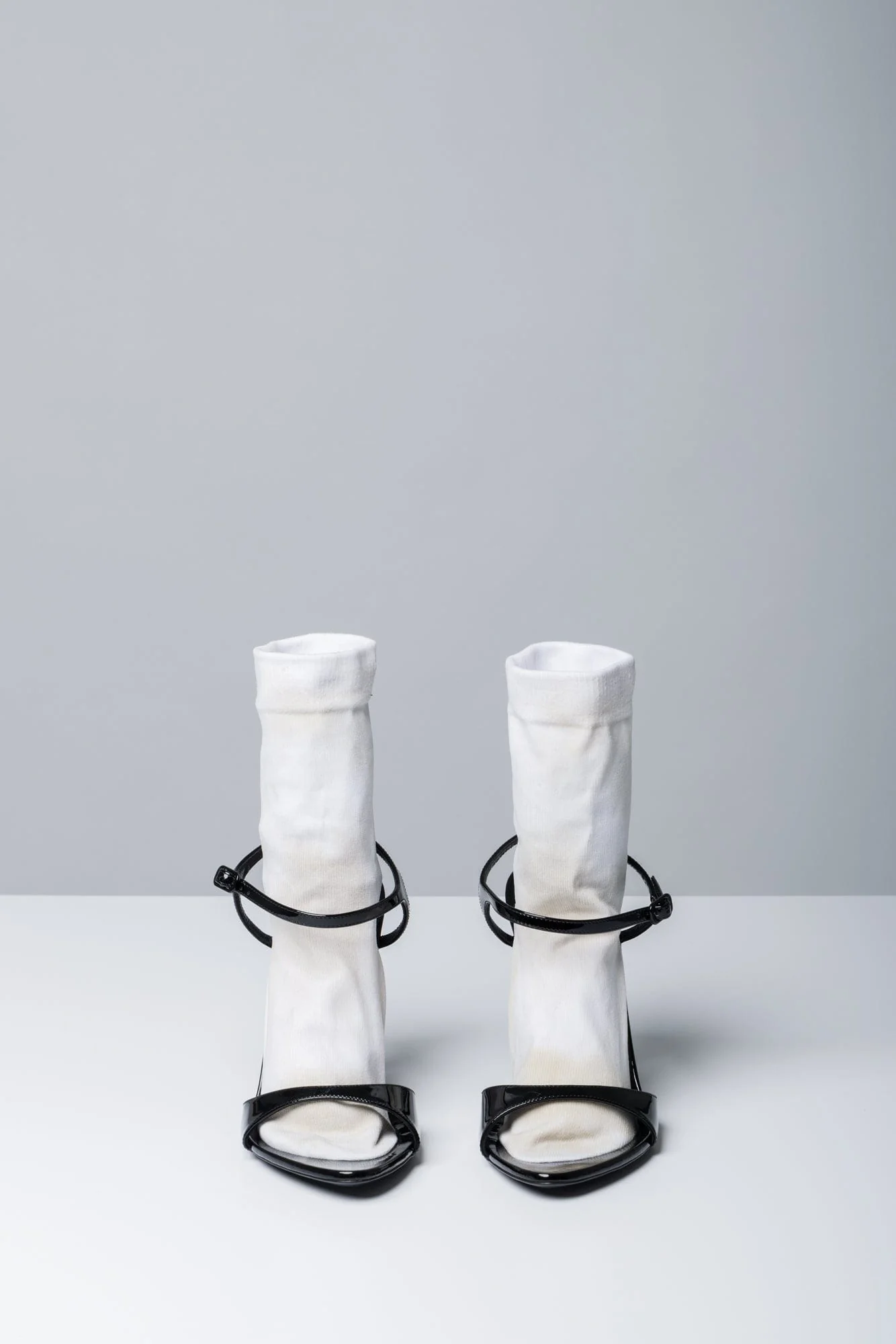 This heel from Balenciagas Spring/Summer 2025 collection feature a fitted sock-like construction secured by a black buckled ankle strap. The leather footbed and sole give the heel structure.