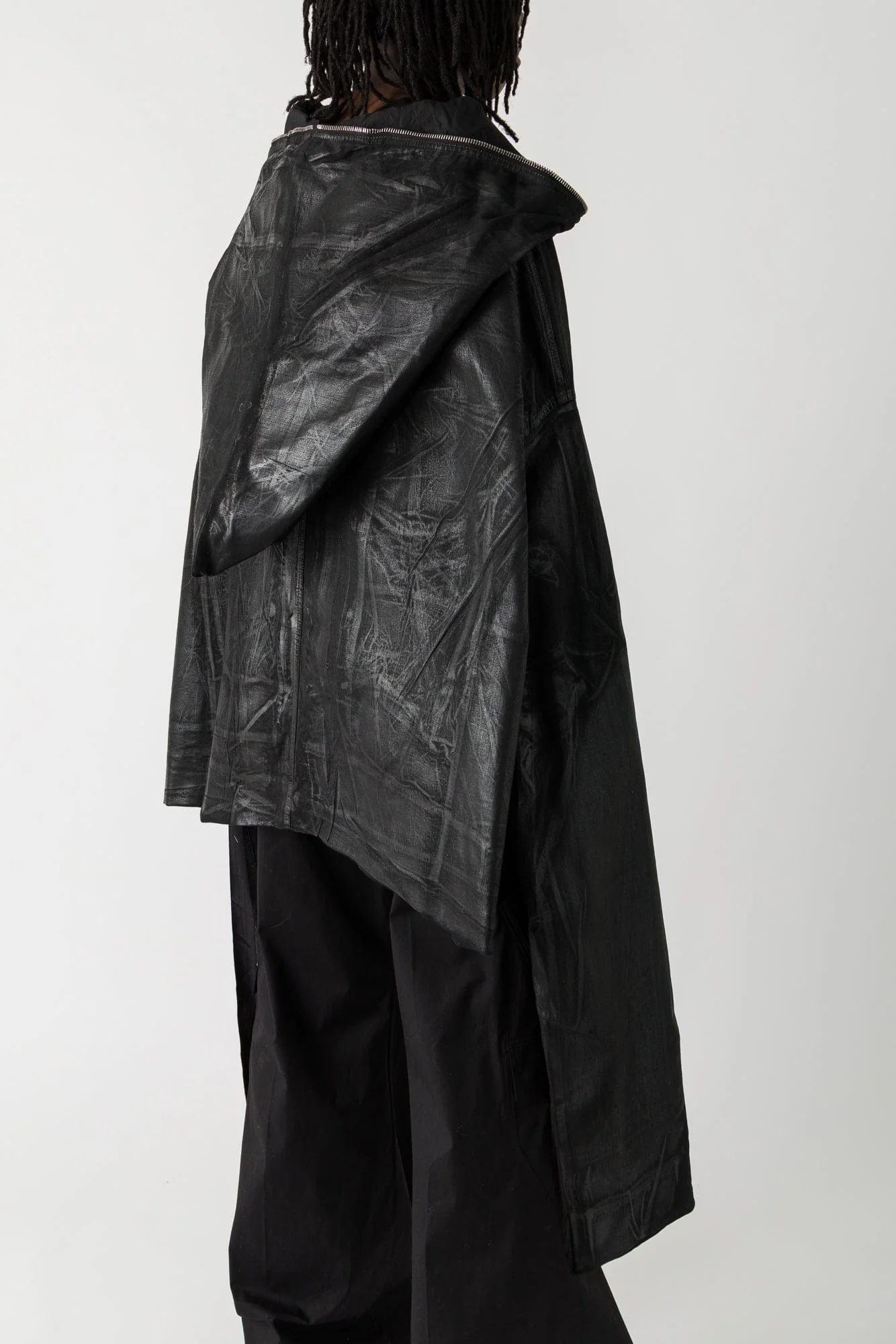 Rick Owens’ Spring/Summer 2025 collection introduces the Gimp Kaftan Jacket, crafted from waxed and garment-dyed stretch denim with a semi-shiny foil finish. It features an extended zip closure that runs through the pointed hood, welt pockets, dropped shoulders, and cutouts at the armscyes for versatile styling. Designed with elongated sleeves, a full plain-woven nylon lining, and an integrated logo-woven strap at the interior.