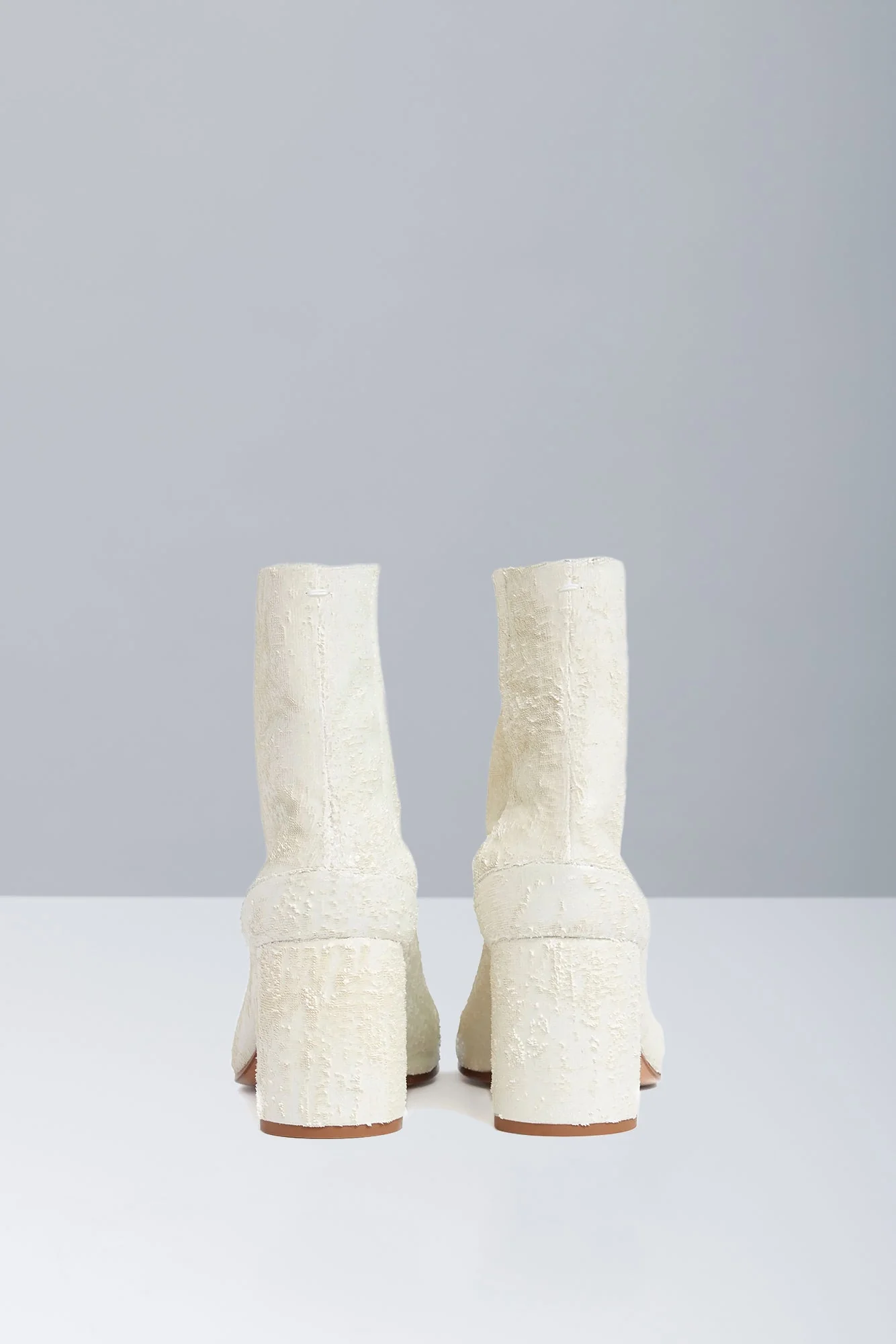 The Maison Margiela Tabi Ankle Boots H80 from the Spring/Summer 2025 collection feature the brand's signature square cleft toe in a contemporary silhouette. The heel collar is marked by Maison Margiela’s discreet white stitching, a subtle yet recognizable detail.