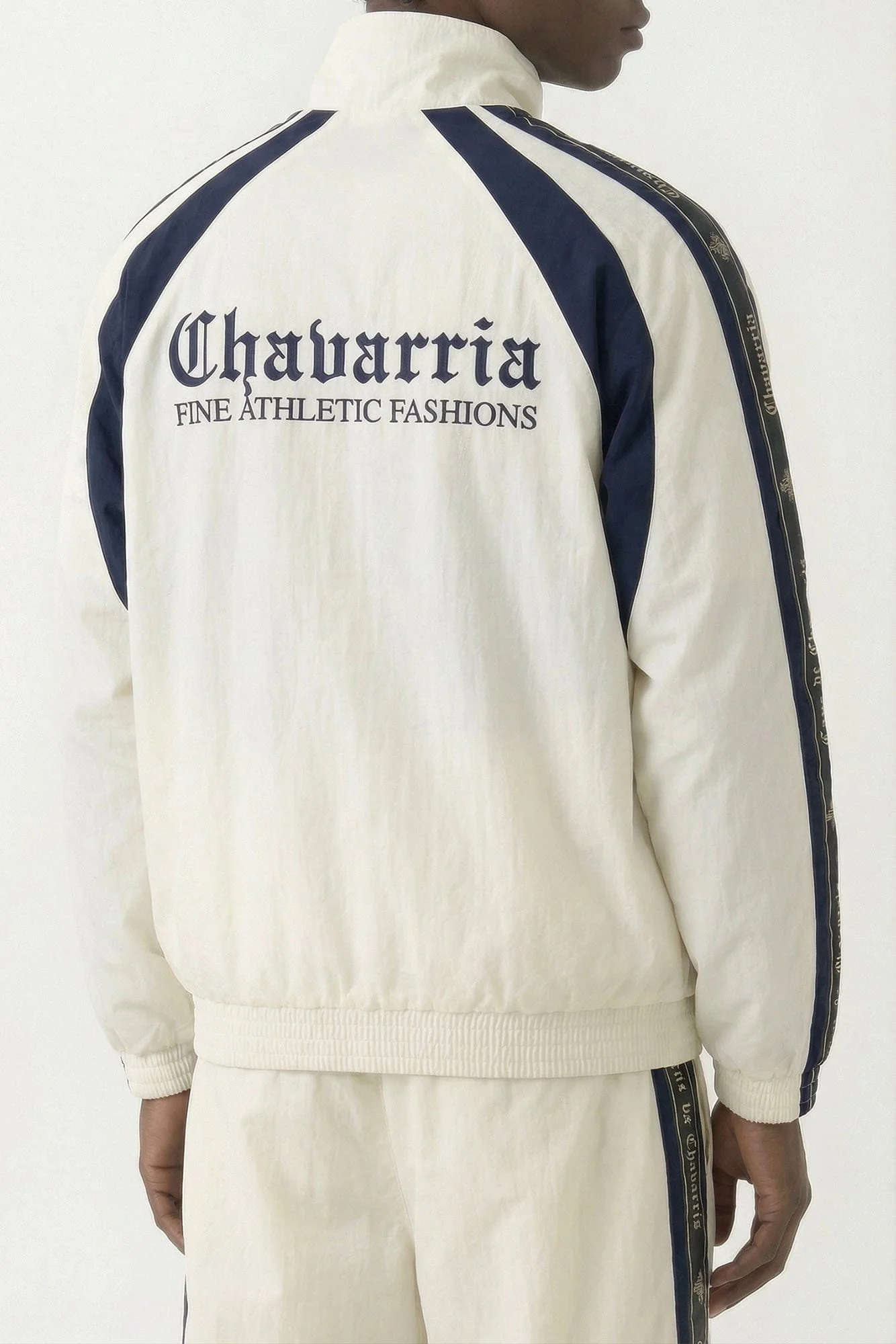 Willy Chavarria presents the Casa De Chavarria Tape Jacket in white from the Spring/Summer 2026 collection. This jacket features an Old English font rendition embroidered on the upper chest. A similar text is printed symmetrically down both arms. The garment is finished with functional pockets, a zip closure, and a lightweight construction.